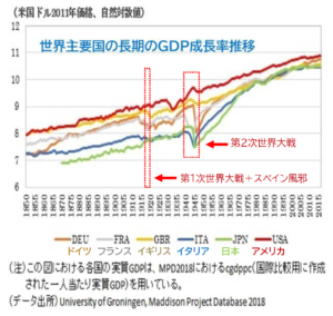 今回のタイトルである『感染症と経済』の感染症。スペイン風邪が発生しています。その上第一次世界大戦まで勃発しています。スペイン風邪とは「風邪」と言う名前がついていますが、その正体はインフルエンザウイルスによるパンデミックです。スペイン風邪というのは俗称で、パンデミックですから世界中で大流行し、スペインだけが大きな被害を受けたわけではありませんし、スペインが発生源ということでもありません。当時は第一次世界大戦中ですので、戦場となった各国では情報統制が敷かれ、インフルエンザの大流行は報道されていませんでした。